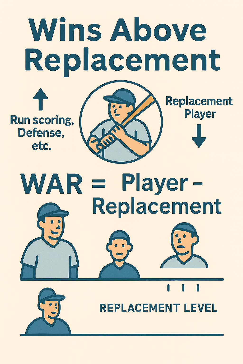 WAR는 “Wins Above Replacement”의 약자로, ‘대체 선수 대비 승리 기여 수치’를 의미합니다. 말 그대로 한 선수가 평범한 대체 선수보다 얼마나 팀 승리에 더 많은 기여를 했는지를 숫자로 나타낸 지표입니다.